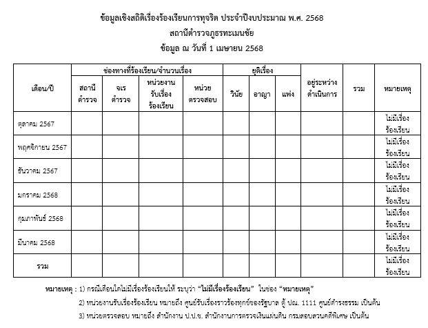 O17 ช่องทางการแจ้งเรื่องร้องเรียนการทุจริตและข้อมูลเชิงสถิติเรื่องร้องเรียนการทุจริต 1 ตุลาคม 2566 โดย thamenchaipolice / ไม่มีหมวดหมู่ ช่องทางการแจ้งเรื่องร้องเรียนการทุจริต 1. ร้องเรียนผ่านหน่วยราชการอื่น 2. ร้องเรียนโดยตรงกับ สภ.ทะเมนชัย ข้อมูลเชิงสถิติเรื่องร้องเรียนการทุจริตประจำปี Facebook iconFacebookTwitter iconTwitterLINE iconLine